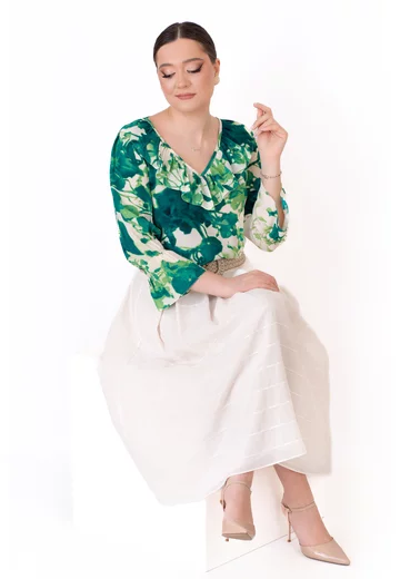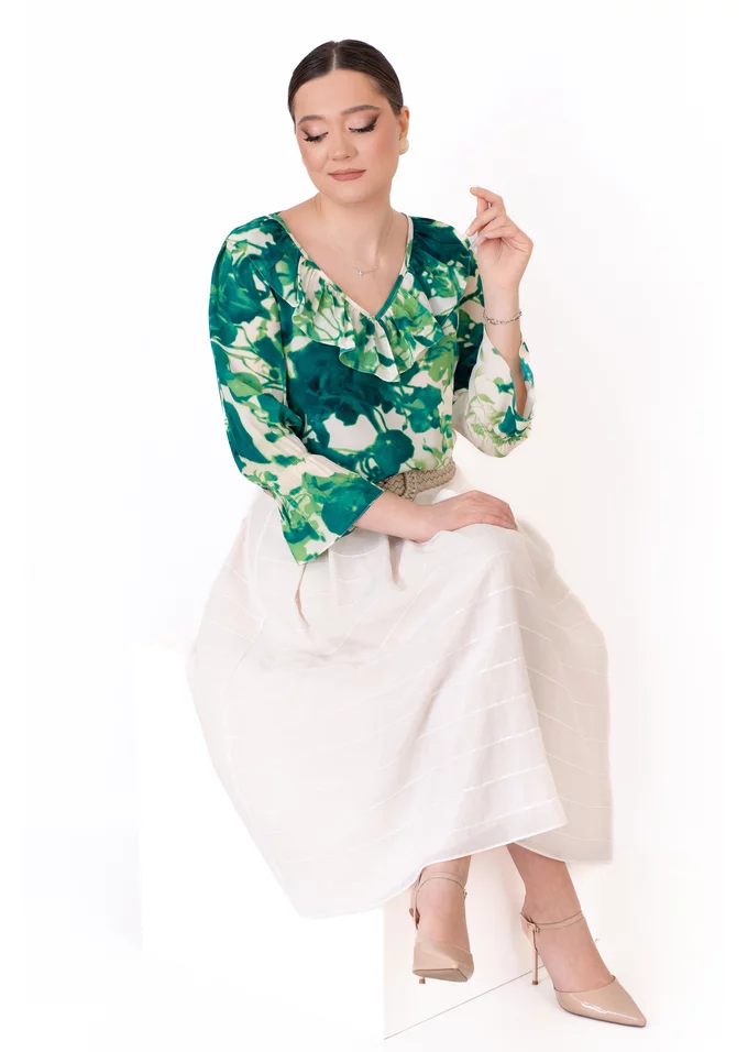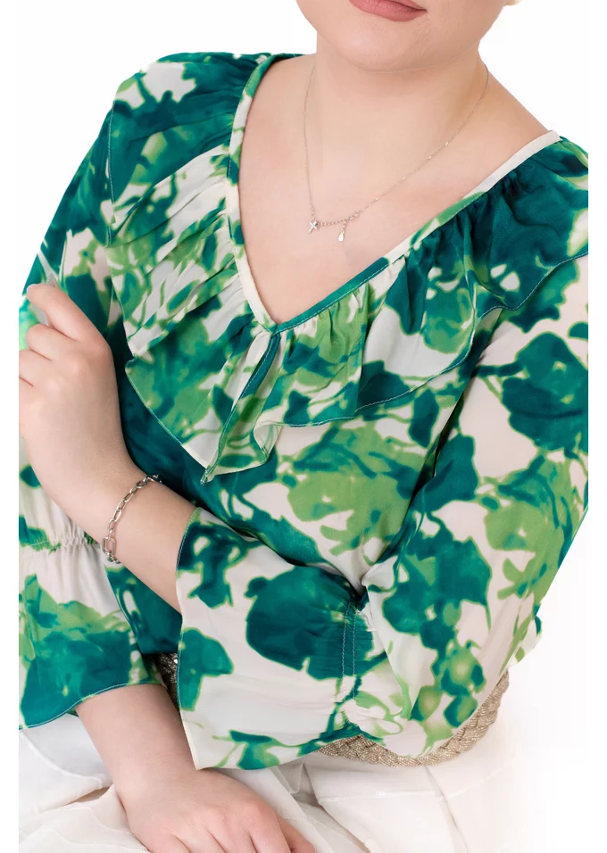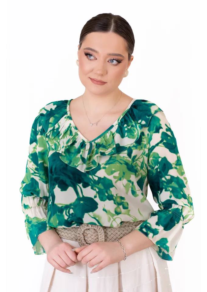 Bluza boemă Aqua Green se remarcă prin nuanța fresh și imprimeul abstract, care adaugă un aer artistic și contemporan designului. Este o piesă versatilă, ideală pentru ținute de zi elegante, combinații smart-casual sau apariții rafinate cu personalitate.