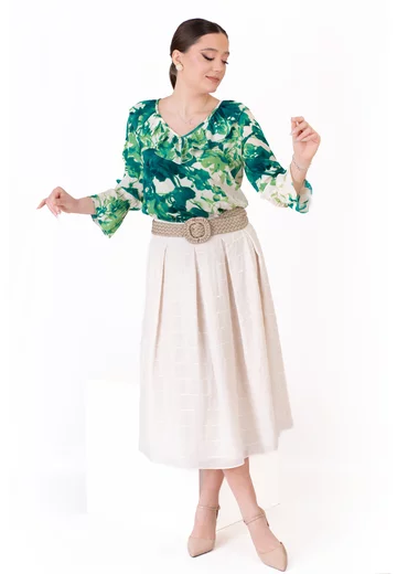 Materialul din vâscoză are o textură fină și fluidă, plăcută la atingere, oferind lejeritate și confort pe durata purtării. Țesătura cade natural pe corp, evidențiind imprimeul abstract și calitatea materialului, oferind un aspect delicat și sofisticat.