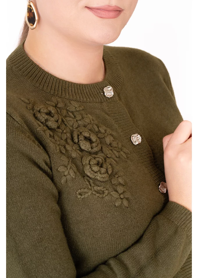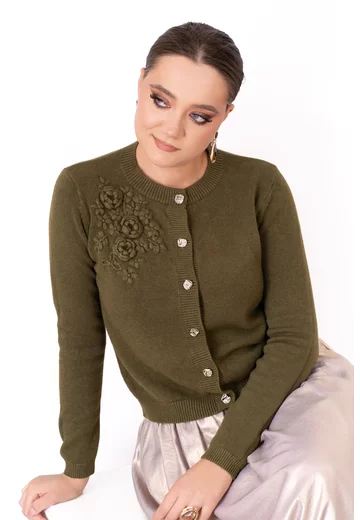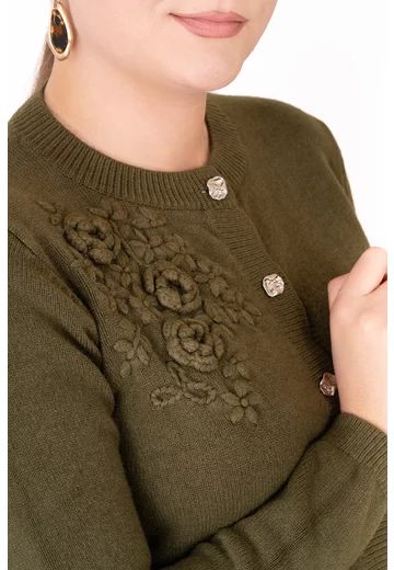 Cardigan elegant verde kaki cu nasturi metalici si broderie din tricot
