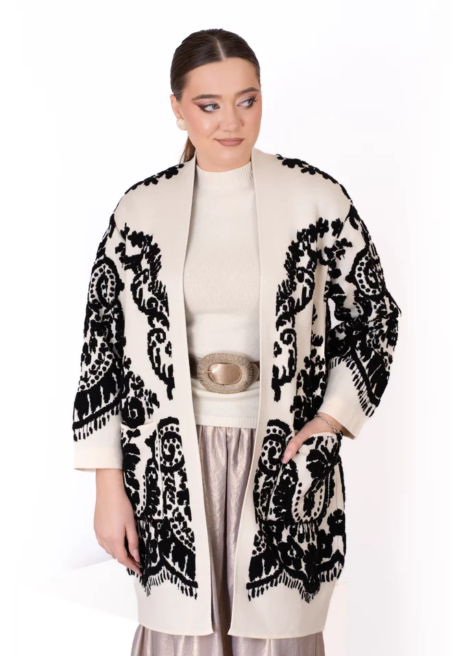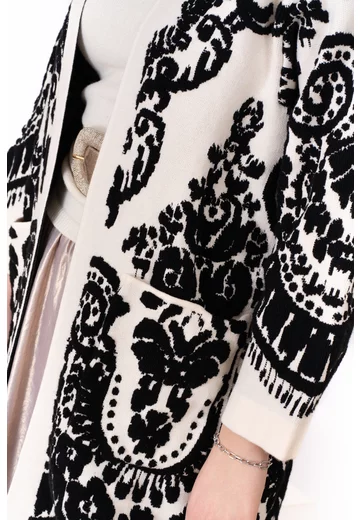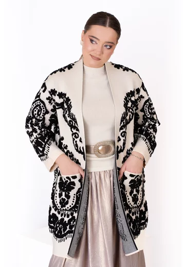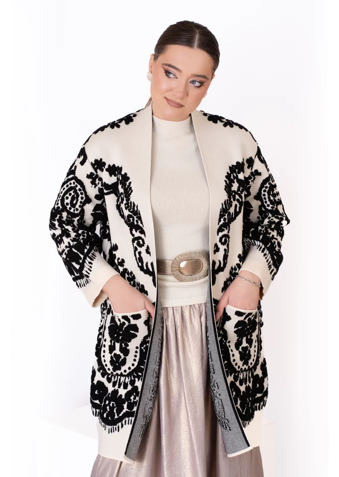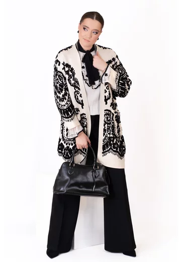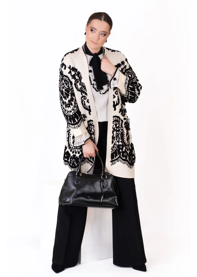 Cardiganul cu model tradițional se remarcă prin textura și detaliile tricotate atent, care îi conferă un aer clasic și elegant. Este perfect pentru ținute casual sau layering peste bluze și cămăși, oferind căldură și stil.