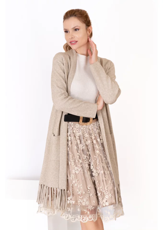 Jerseul grej se remarcă prin detaliile cu franjuri și buzunarele practice, care adaugă un aer boho și un plus de funcționalitate. Este ideal pentru layering peste bluze sau cămăși, oferind confort și stil relaxat.