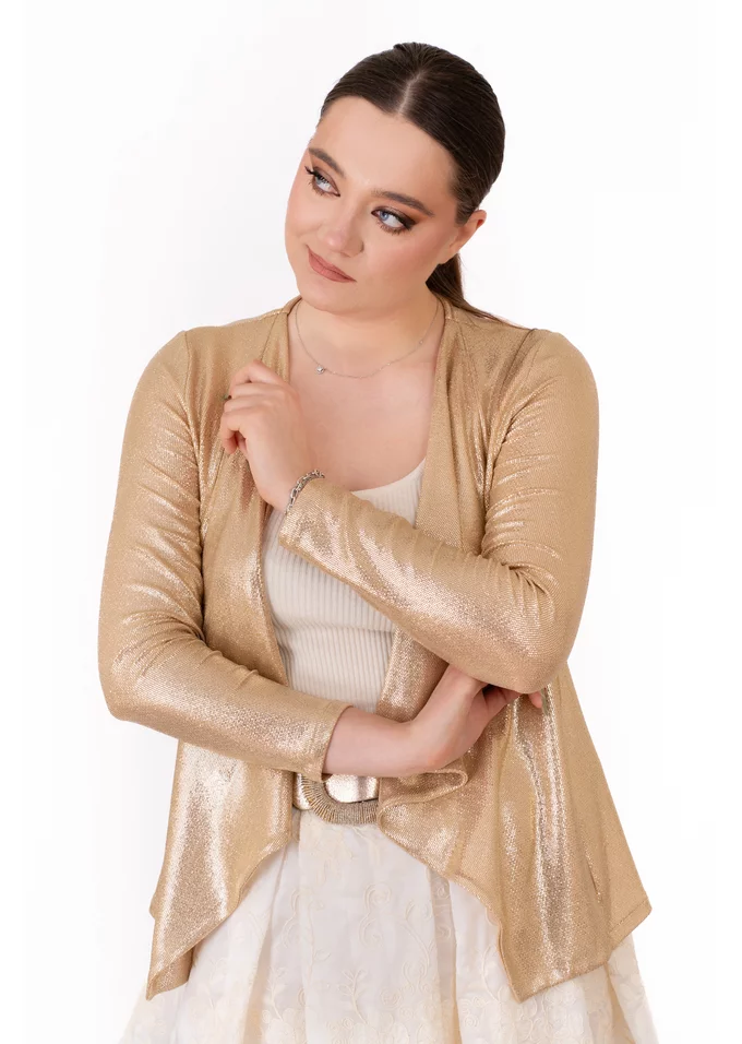 Jerseul Liquid Gold peliculizat impresionează prin finisajul său lucios, care conferă un efect metalic sofisticat și contemporan. Această piesă transformă orice ținută într-o apariție remarcabilă, fiind ideală pentru evenimente speciale sau look-uri de seară pline de impact.
