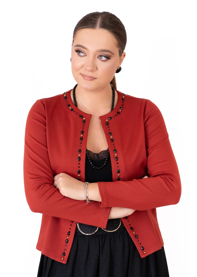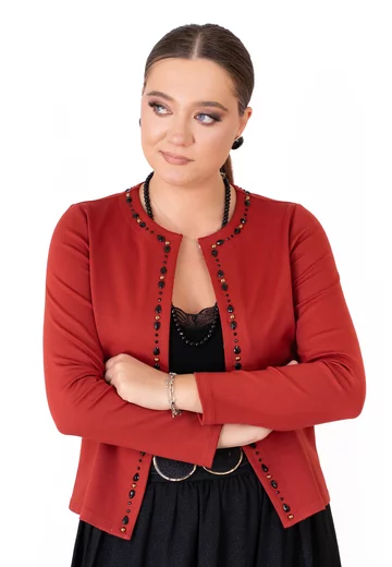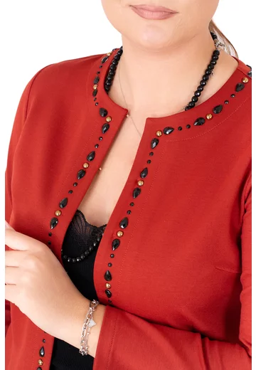 Jerseu opulent scarlet accesorizat cu pietre și strasuri – eleganță îndrăzneață și expresivă