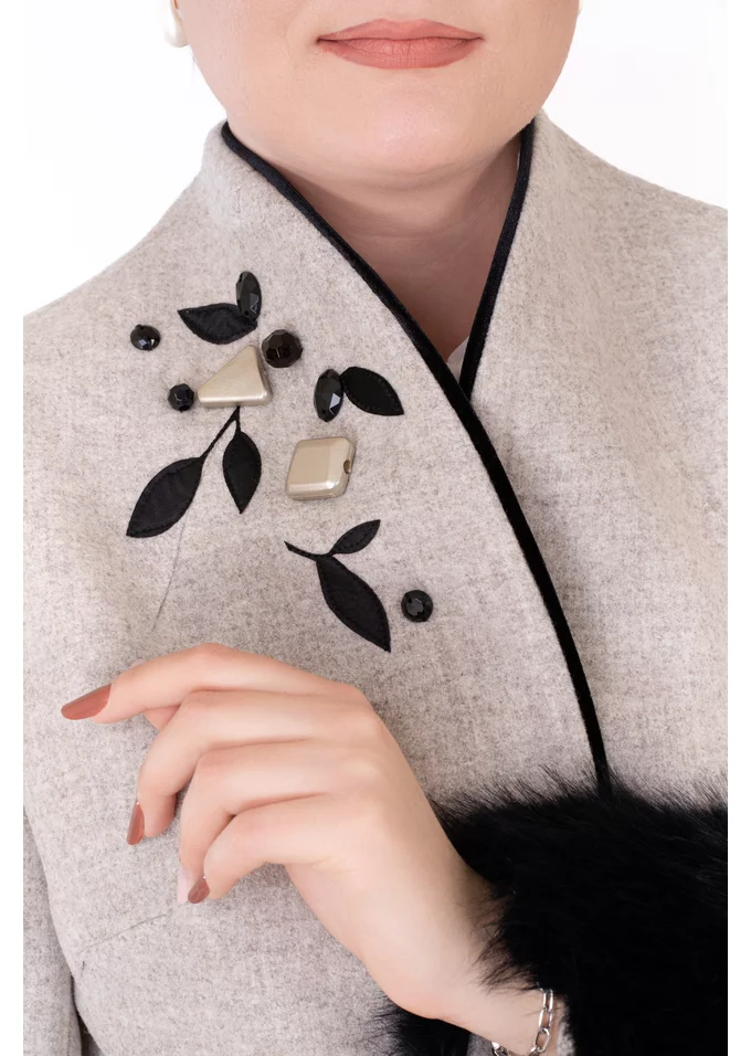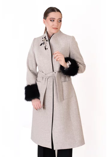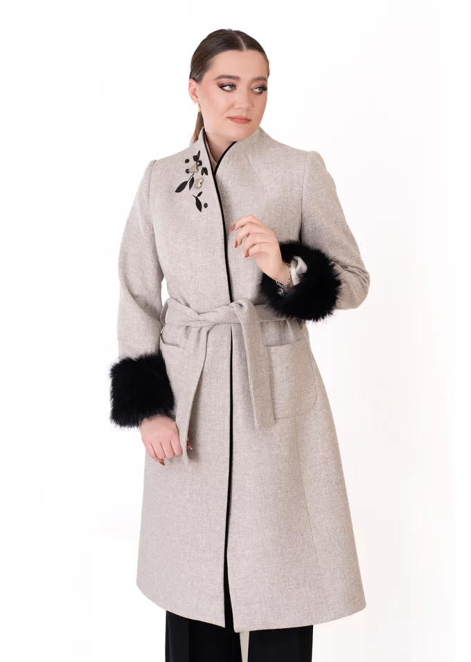 Palton scurt „Smokey Chic” fumuriu cu cordon, blăniță și detalii din pietre – eleganță sofisticată și confort premium