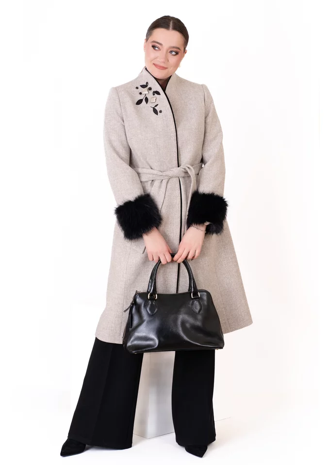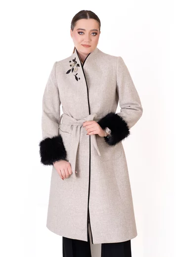 Paltonul „Smokey Chic” se remarcă prin nuanța sa fumurie elegantă și detaliile atent lucrate: cordon în talie, blăniță delicată și accente discrete din pietre, care conferă un efect sofisticat și modern. Realizat din lână 100% premium, cu căptușeală fină din vâscoză, paltonul oferă confort termic, fluiditate la purtare și un look rafinat, ideal pentru ținute de zi cu accente sofisticate sau apariții elegante.