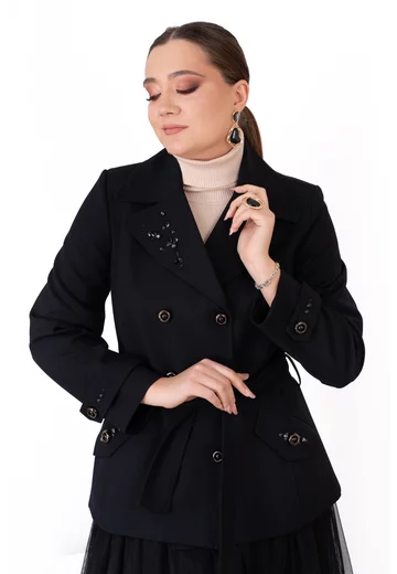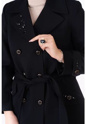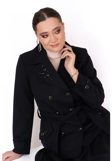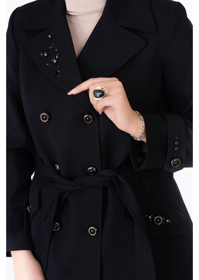 Trenci negru carbune din amestec de lana cu accente din pietre pe rever