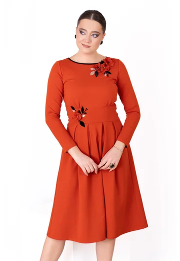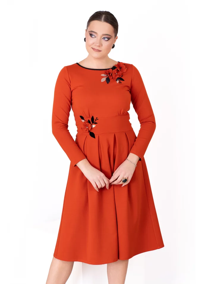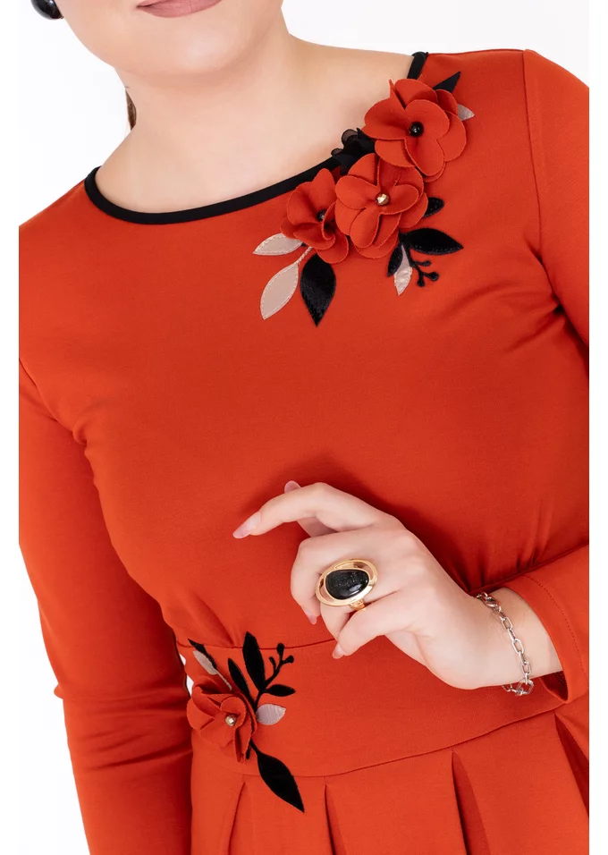 Rochia Scarlet Grace din jerse decorată cu flori – eleganță feminină și rafinament