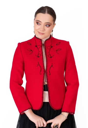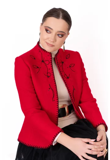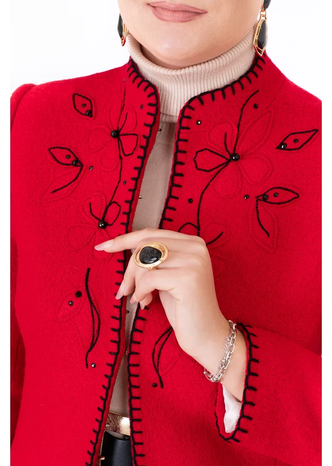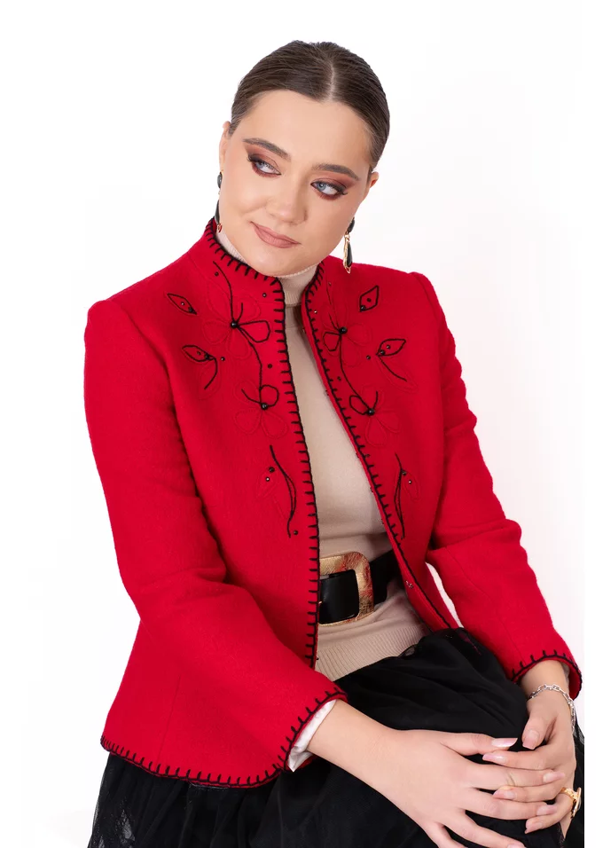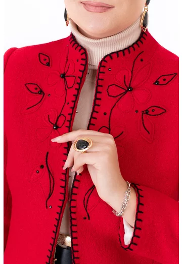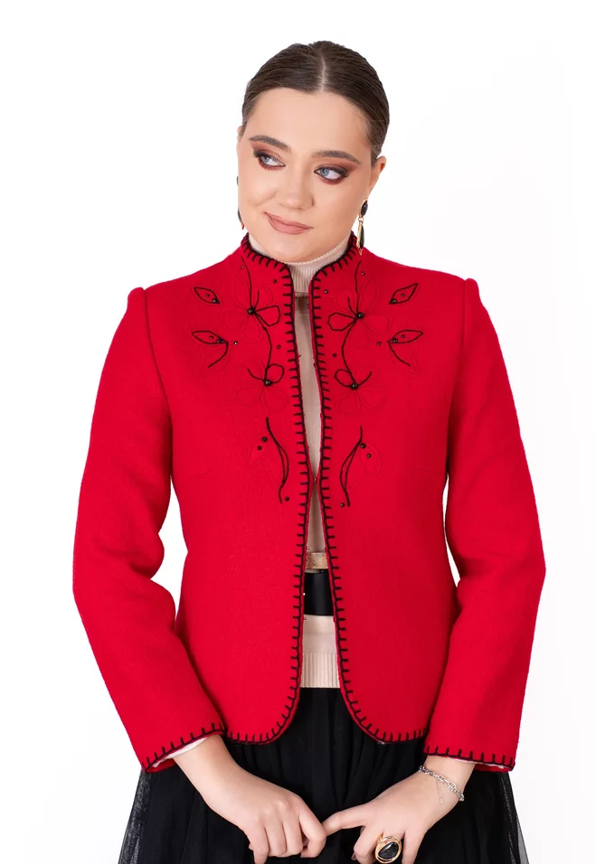 Sacou fine stitch rosu din lana boucle decorat cu flori brodate