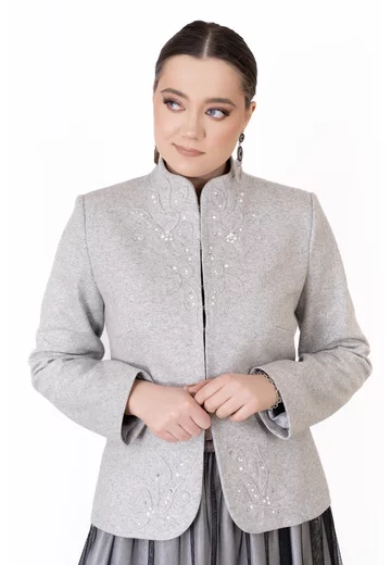 Sacou stylish din lana gri decorat cu broderie , strasuri si perle