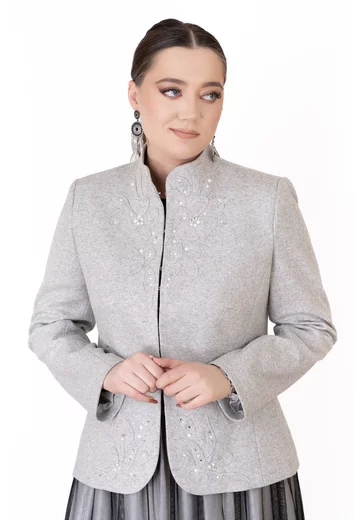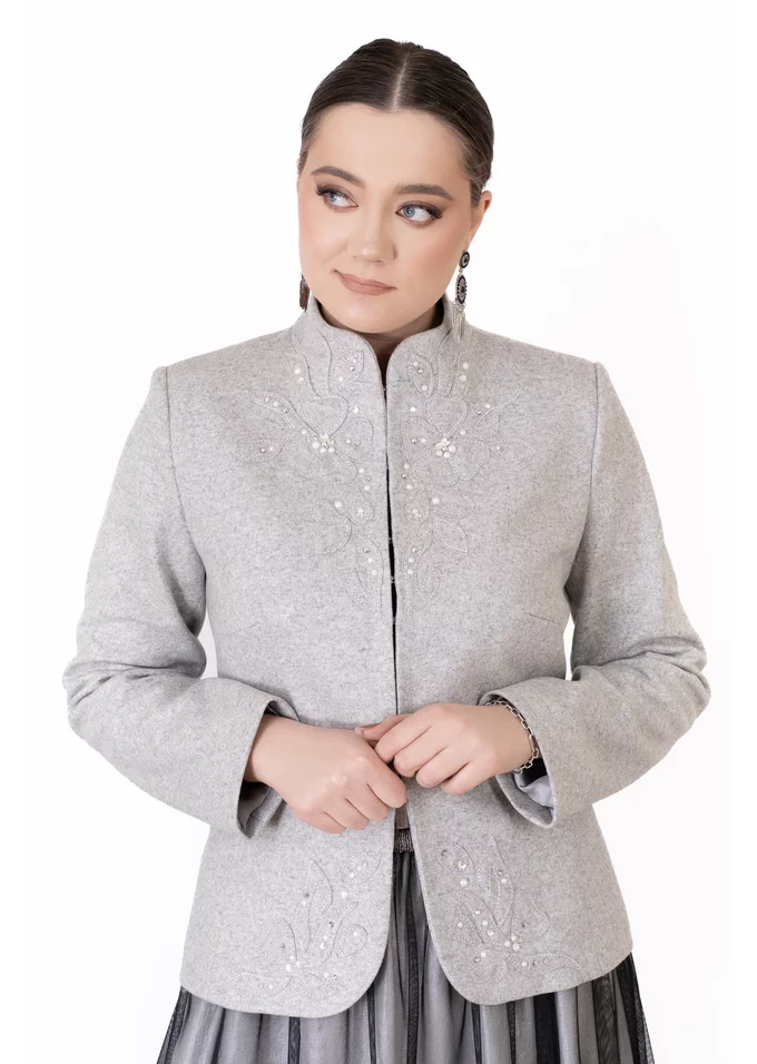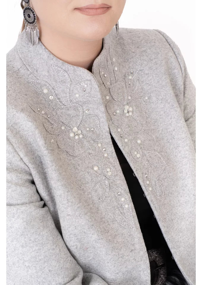 Sacou Stylish din lână gri – broderie, ștrasuri și perle