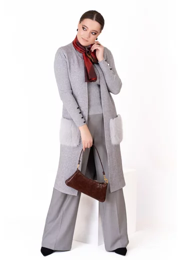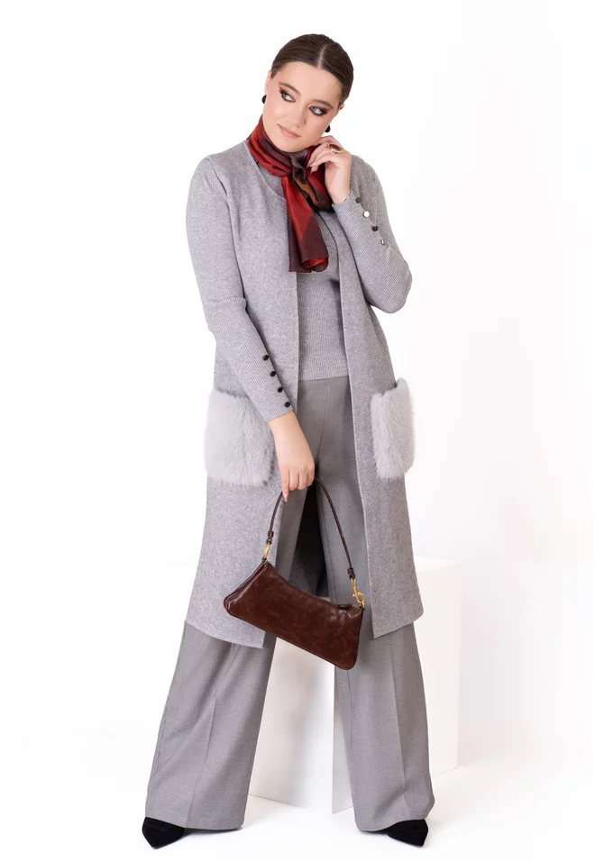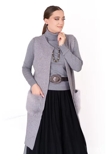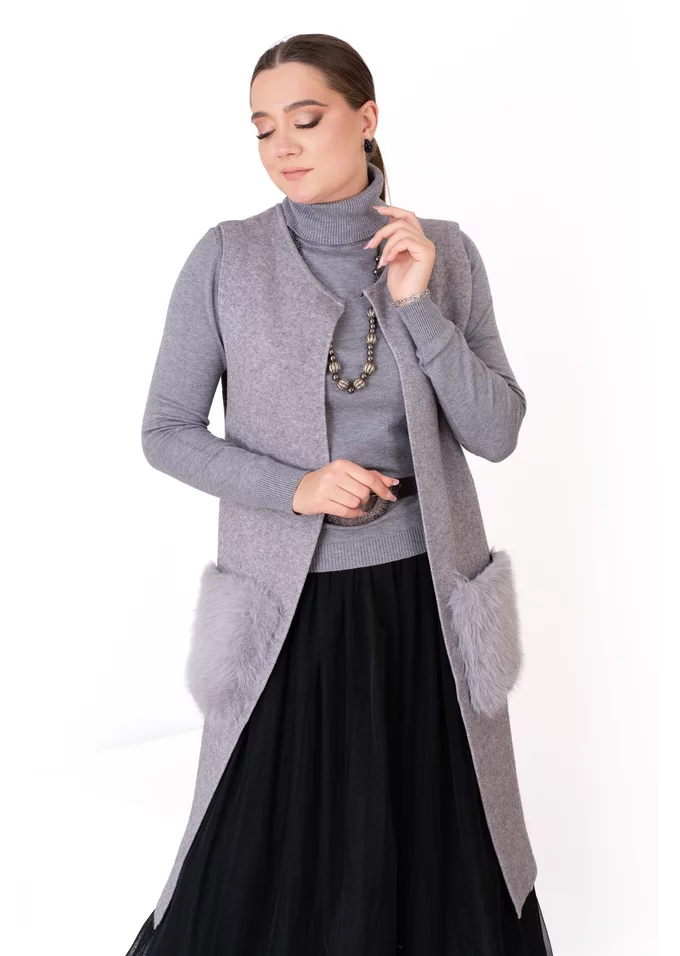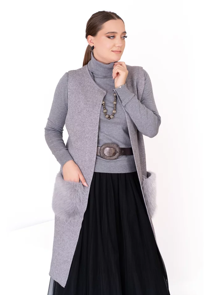 Vesta gri tricotată cu buzunare din blăniță – confort și stil în layering